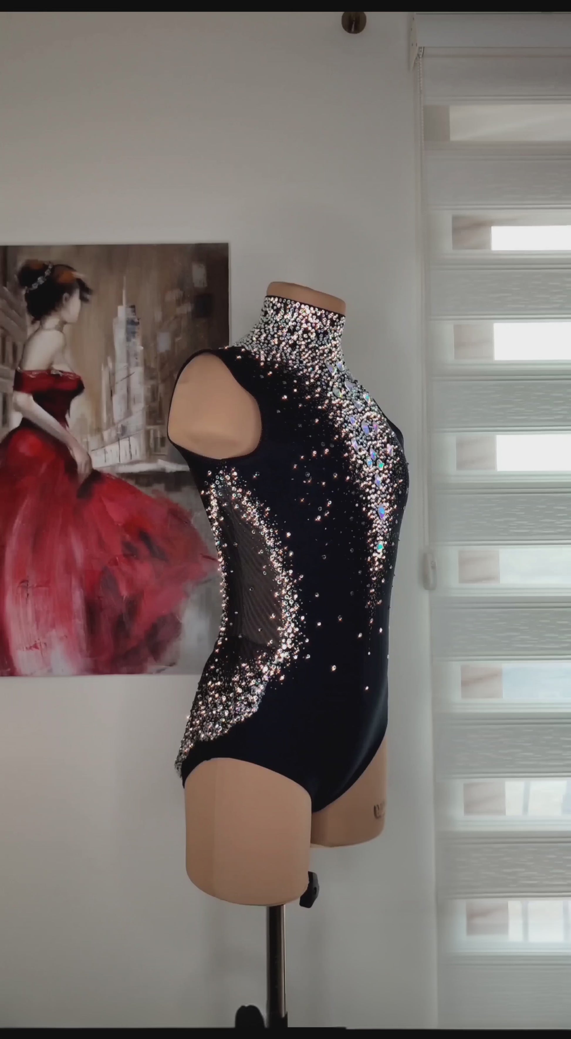 Designed for competitions, this leotard features a structured crystal composition that enhances the silhouette, elongates the lines, and creates a refined, elegant stage presence.
