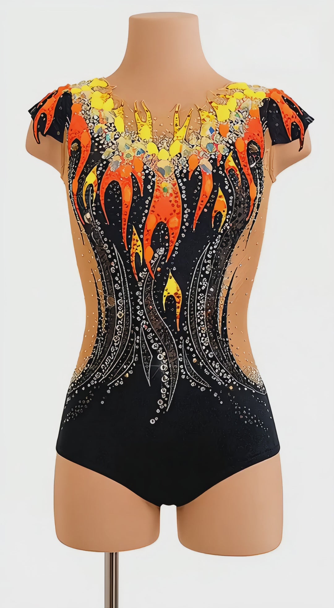 Each design is handcrafted in Europe using competition-grade fabrics and premium crystals. The leotard is engineered for secure fit, comfort, and strong visual presence on the floor.