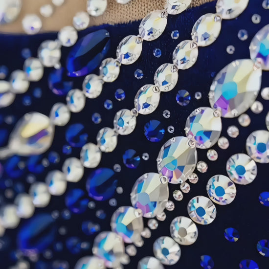 Each design is handcrafted in Europe using competition-grade fabrics and premium crystals. The leotard is engineered for secure fit, comfort, and strong visual presence on the floor.